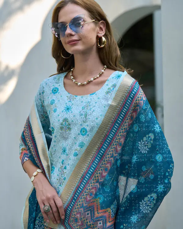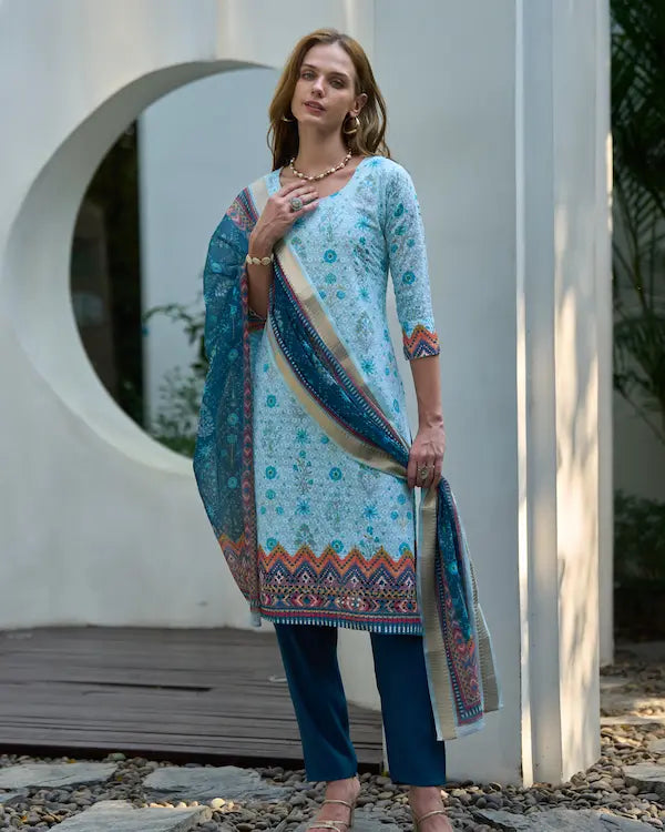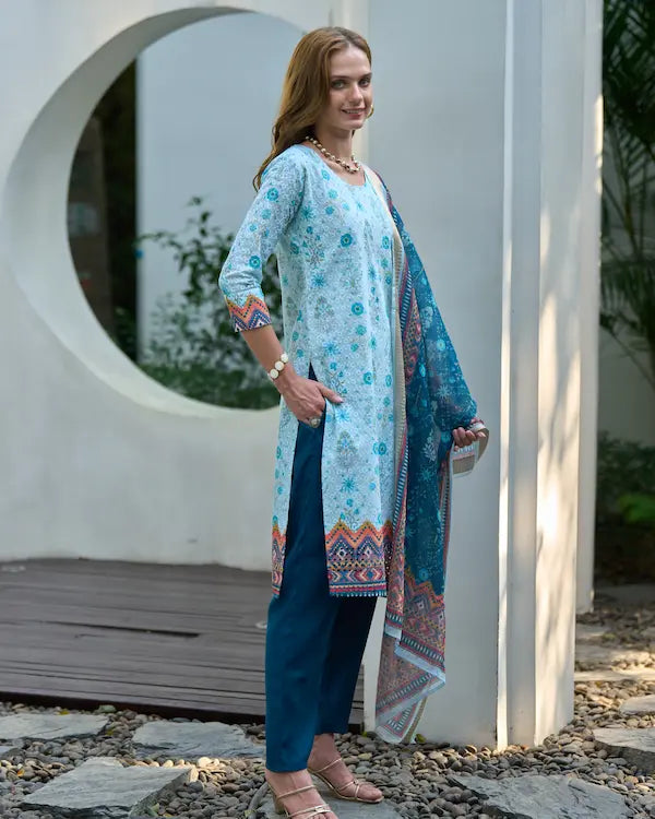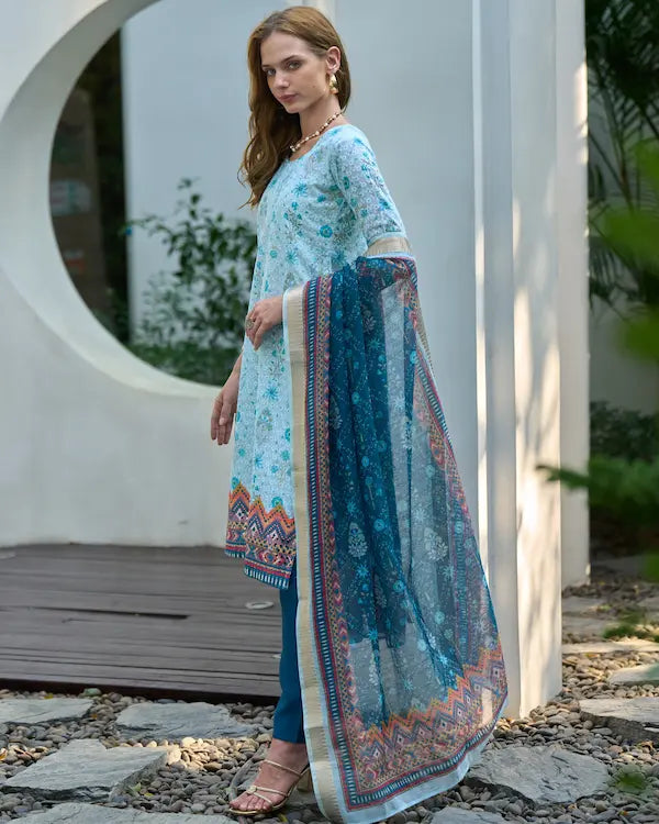 Say hello to Aqua Bloom — a refreshing 3-piece kurti set in breathable white cotton sprinkled with floral turquoise motifs, contrasted with a printed linen dupatta and deep teal Roman pants. Perfect for brunch scenes, office chic, or casual get-togethers, this look radiates calm confidence and modern desi style.