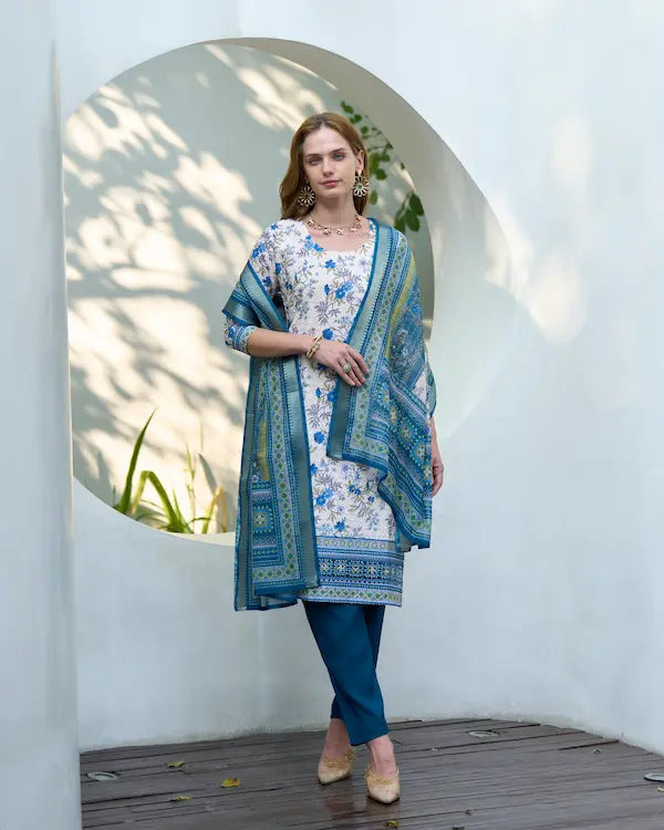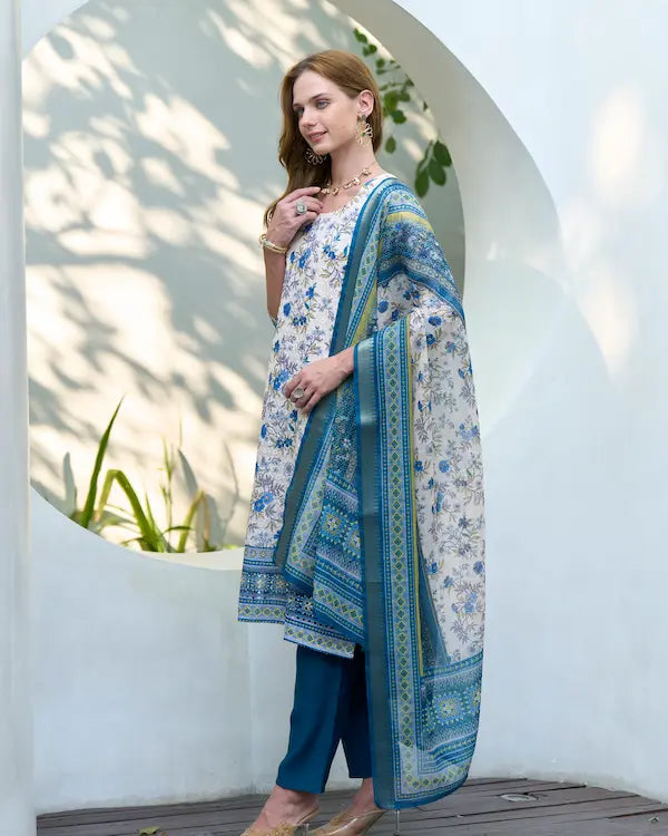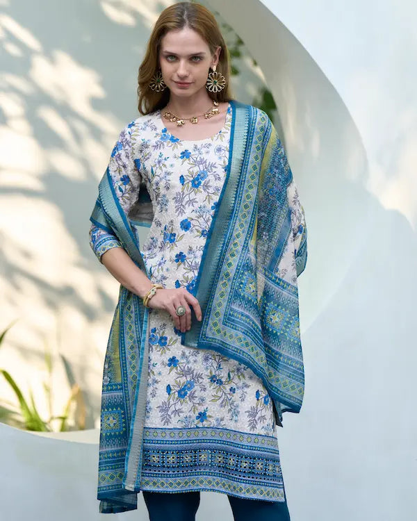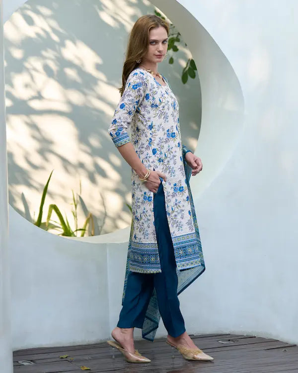 Step into poetic elegance with Azure Bloom — a soothing 3-piece kurti set in airy white cotton, blooming with blue floral motifs and paired with a breezy linen dupatta in teal and lime accents. The deep blue Roman pants add depth and refinement. This set balances tradition and tranquility, turning heads without raising your voice.