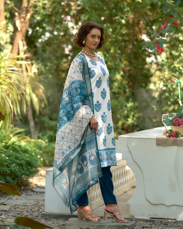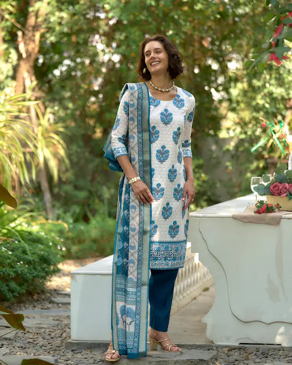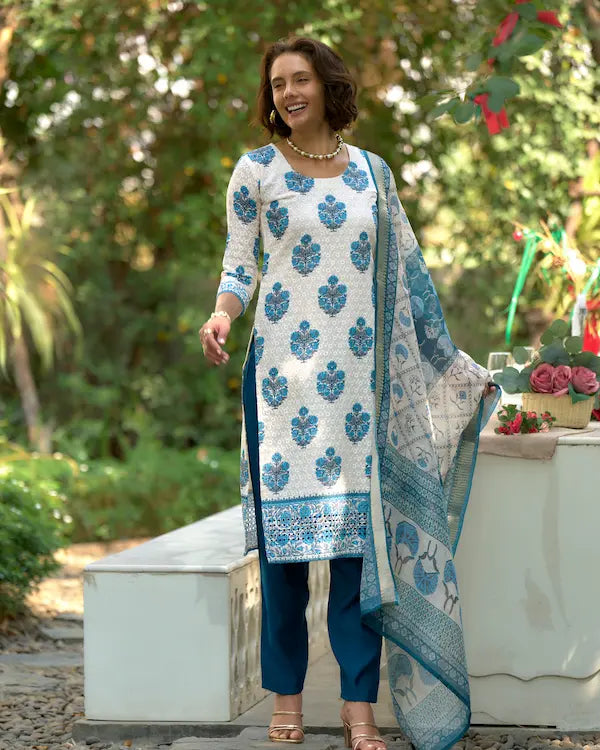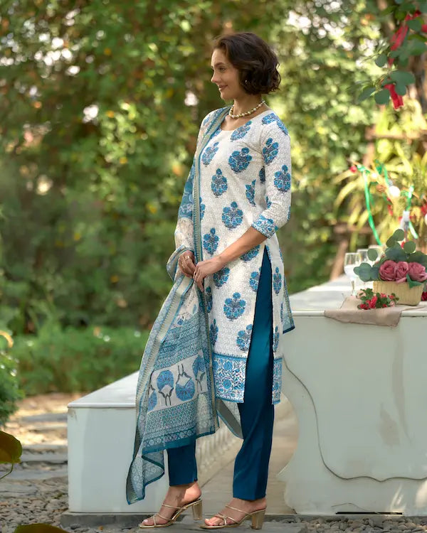 Blue Brilliance White Cotton Kurti Set with Dupatta | Roman Fabric