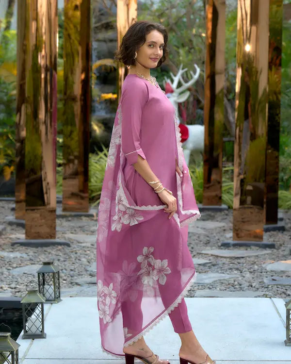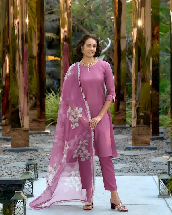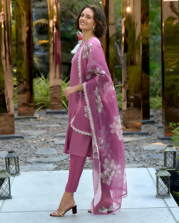 Meet Blush Bloom — a romantic 3-piece kurti set in rosy mauve vatican fabric, exuding elegance with its clean lines and flattering fall. The sheer organza dupatta, blooming with ivory florals and finished with scalloped lace, adds the right dose of dreamy charm. Paired with matching pink vatican pants, this look is where charm meets comfort, beautifully.
