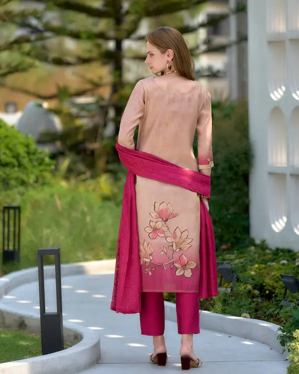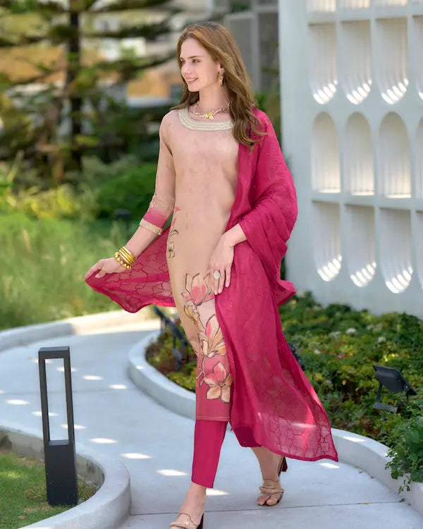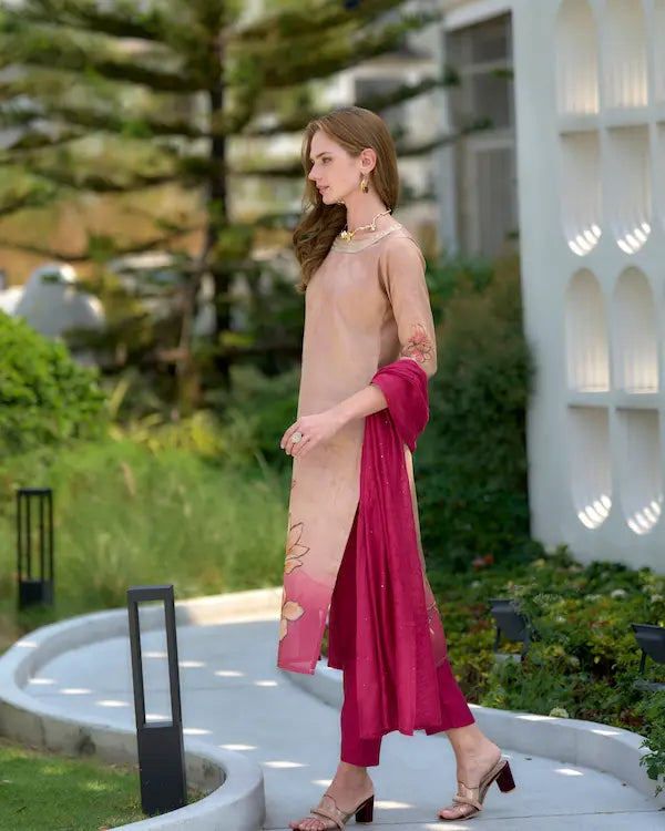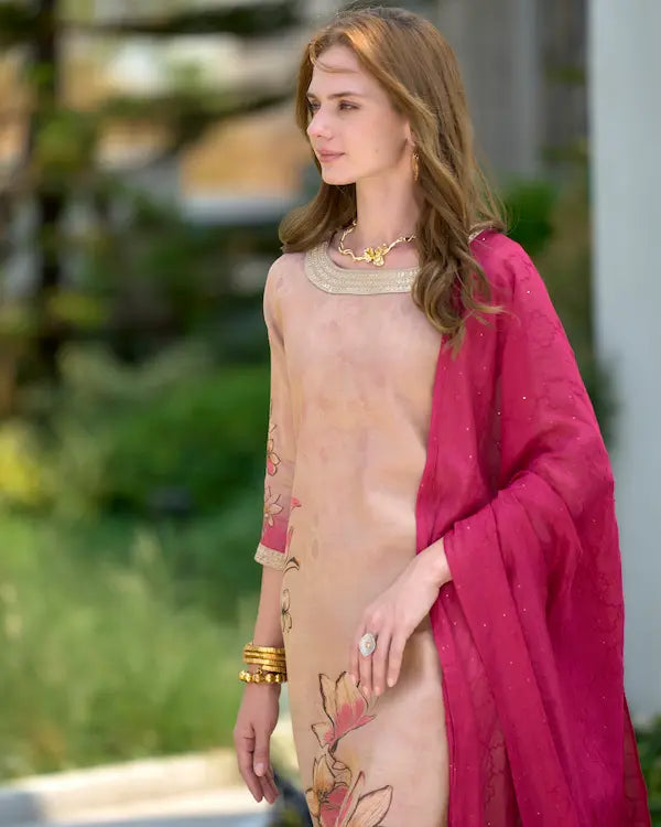 Crimson Bloom Beige Embroidered Kurti Set with Dupatta | Tissue Fabric