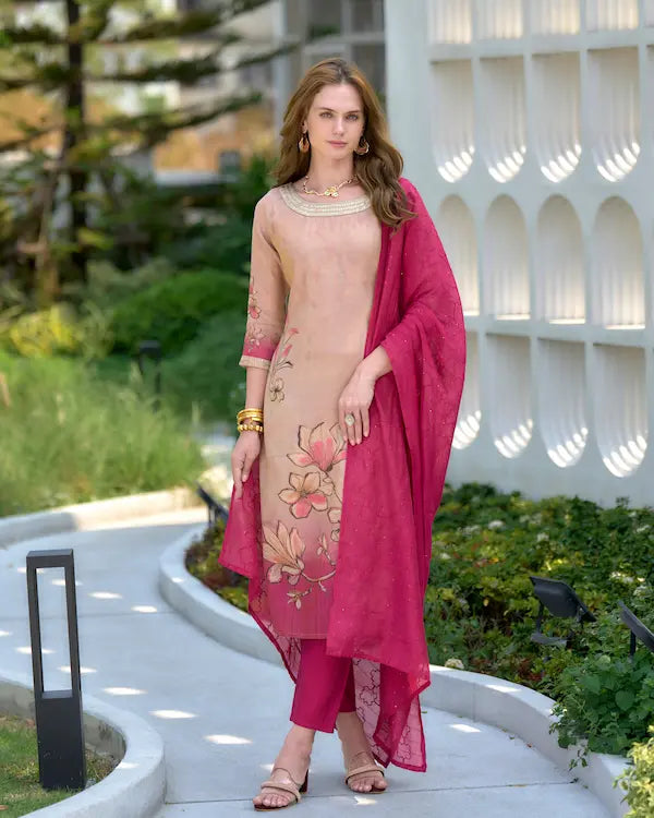 | Kurta Fabric | Tissue with floral print and embroidery |