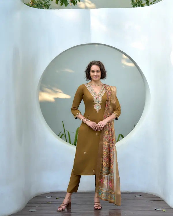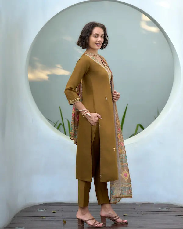 Presenting Desert Bloom — a grounded yet graceful 3-piece kurti set in a rich brown Vatican fabric, featuring ornate thread embroidery around the neckline and cuffs. The warm-toned Chanderi butti dupatta bursts with ethnic detail, adding texture and vibrance to this timeless base. It’s a standout pick for cultural events, festive dinners, or dignified daywear.