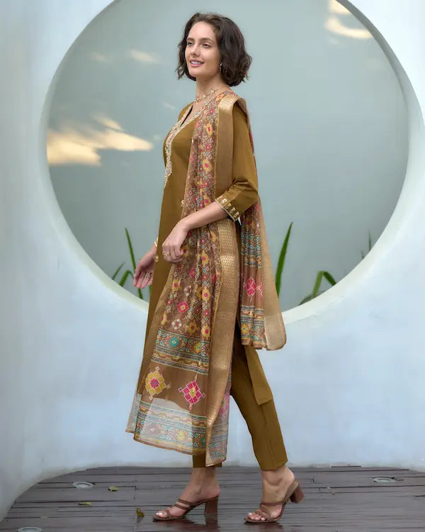 Desert Bloom Brown Embroidered Kurti Set with Dupatta | Vatican-Chanderi Butti