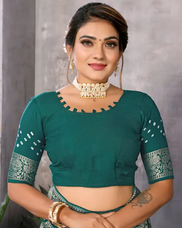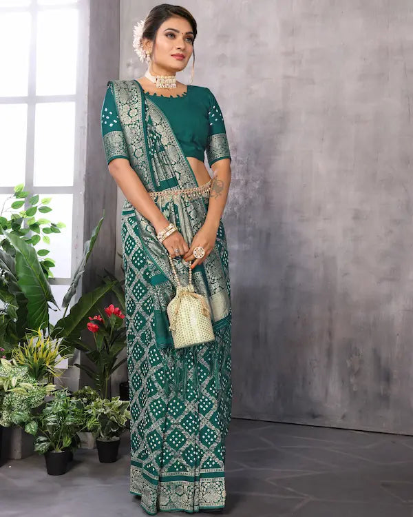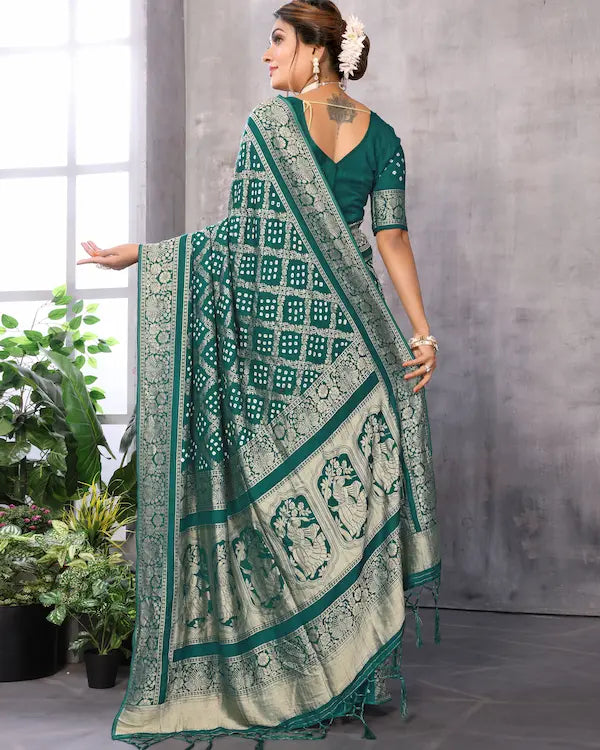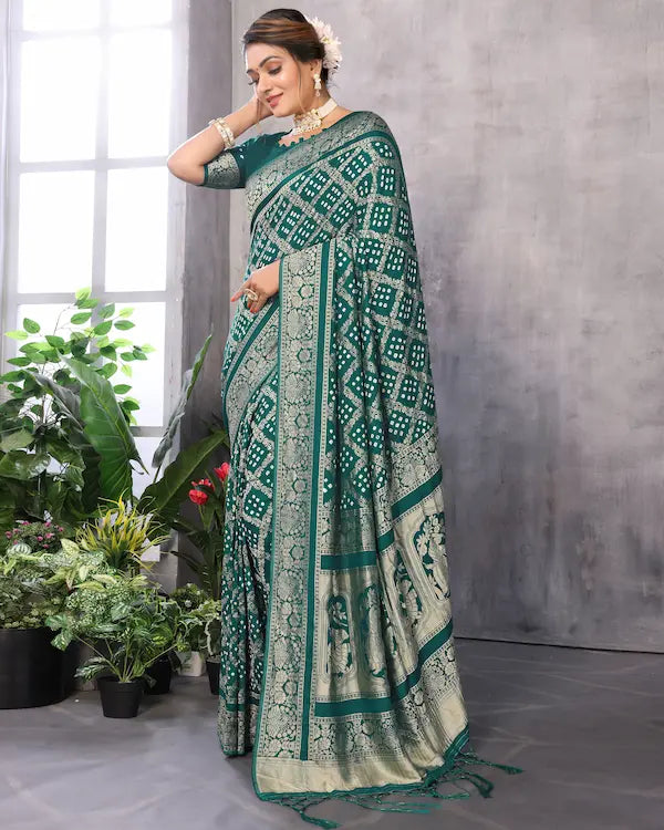 Emerald Raas Green Bandhani Saree with Dandiya Pallu | Misco Gaji Fabric