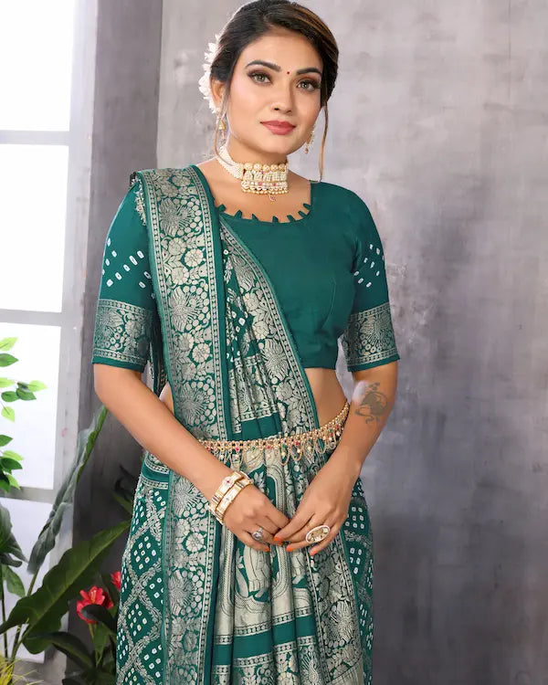 Step into festive grandeur with the Emerald Raas Green Bandhani saree — a tribute to Indian artistry and celebration. Woven from luxurious misco gaji, this saree features an all-over Bandhej pattern highlighted by a striking pallu adorned with classical dandiya motifs and elegant tassels. The deep emerald green hue paired with intricate golden detailing creates an ethereal silhouette, perfect for Navratri nights, wedding rituals, and traditional gatherings. A Day2Day Lifestyle exclusive that captures the spirit of festivity with unmatched charm.