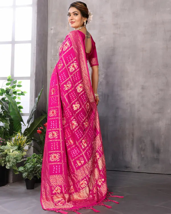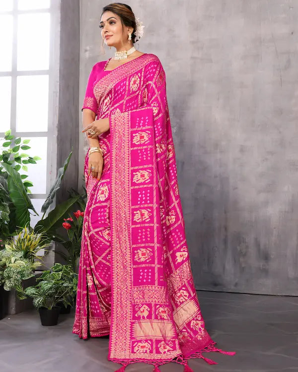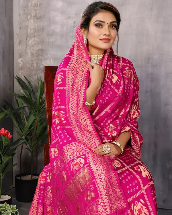 Fuchsia Majesty Pink Patola Print Saree with Golden Zari | Gaji Soft Silk Fabric