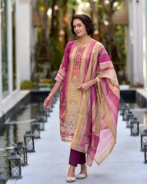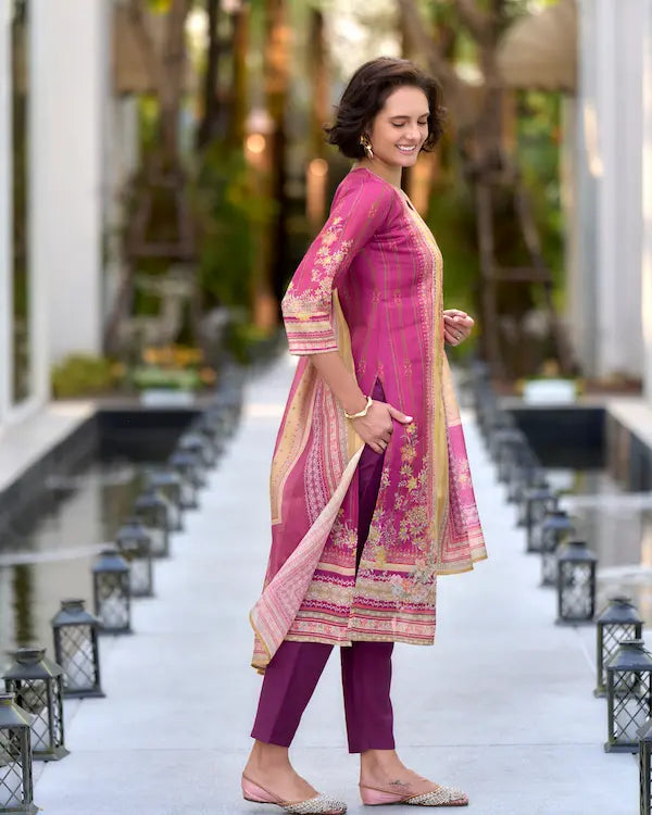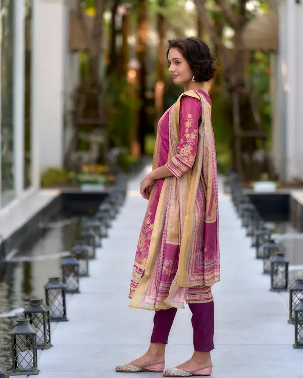 Step into a regal mood with Gold Blossom Pink — a radiant 3-piece kurti set designed in lustrous silk blend fabric. The kurta glows in soft golden tones paired with deep pink magenta accents and intricate embroidery. The ornate printed dupatta adds finesse, while Vatican pants complete the ensemble with comfort and structure. Ideal for weddings, festivities, or that standout daytime function!
