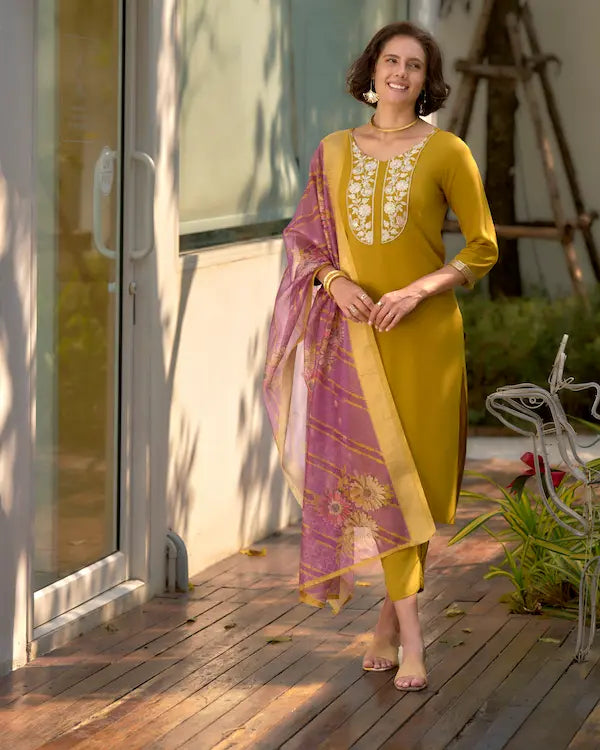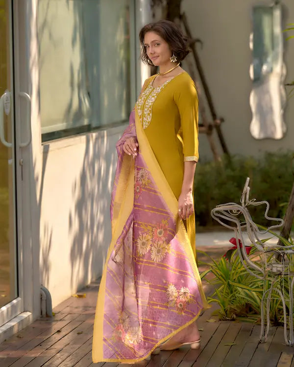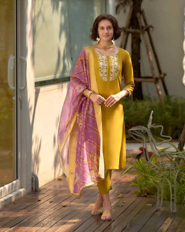 Meet your new festive essential – the Golden Marigold kurti set, glowing with mustard tones and floral finesse. The elegant embroidery, tissue-feel richness, and breezy organza dupatta blend tradition with effortless glam.