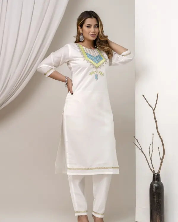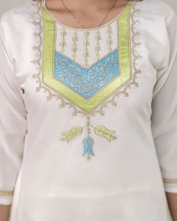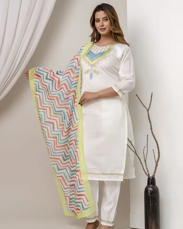 Ivory Grace Embroidered Roman Silk Kurti Set with Chevron Dupatta