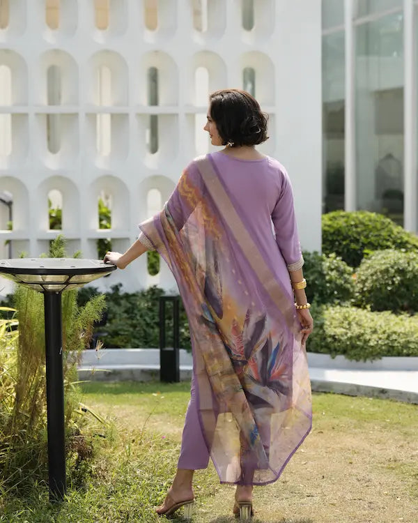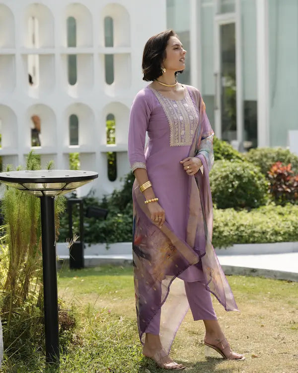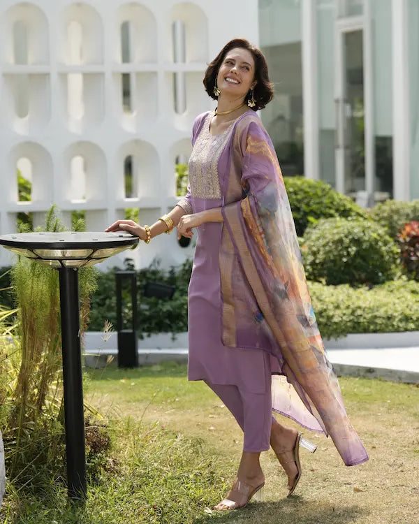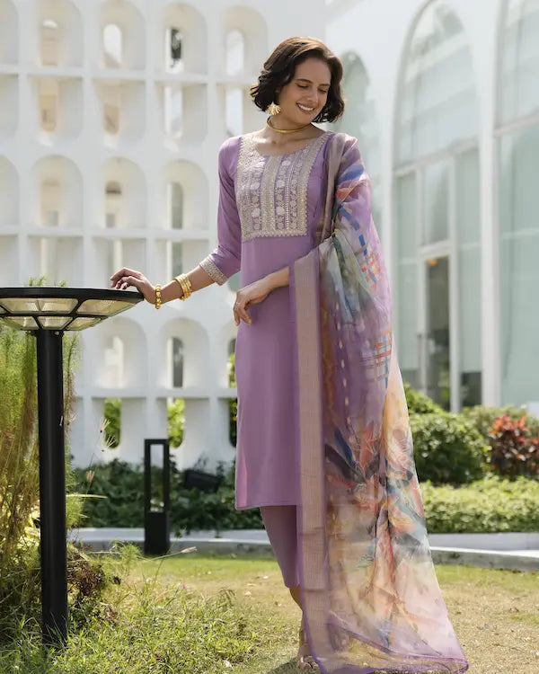 Lavender Luxe Embroidered Kurti Set with Printed Dupatta | Viscos-Rayon Fabric