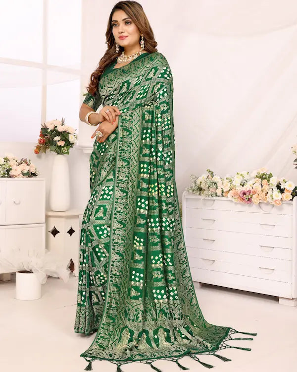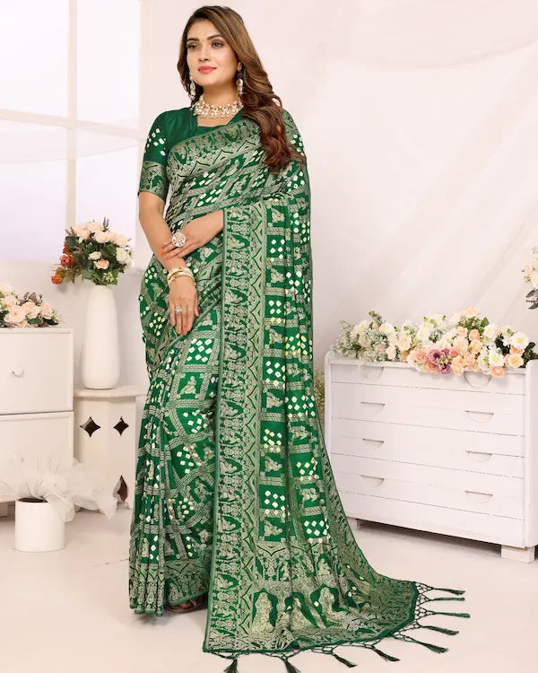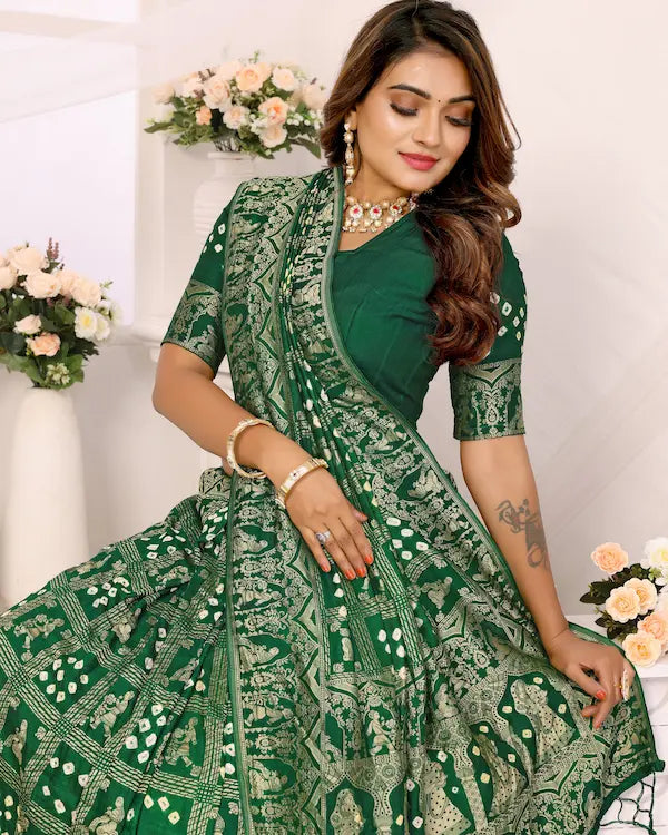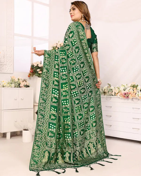 Mehndi Grid Green Bandhani Saree with Golden Dandiya Pallu | Gaji Silk Fabric