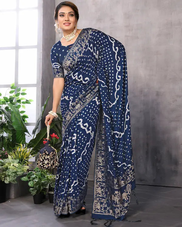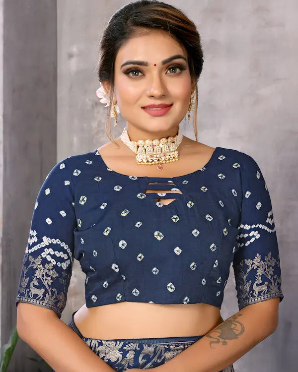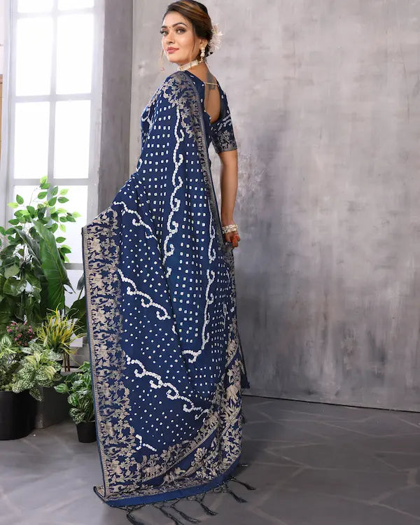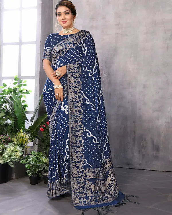 Midnight Mirage Blue Bandhani Saree with Antique Gold Weaving | Gaji Soft Silk Fabric
