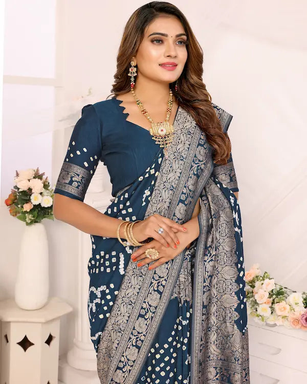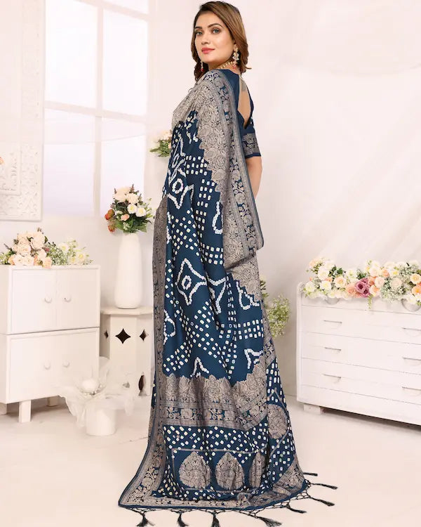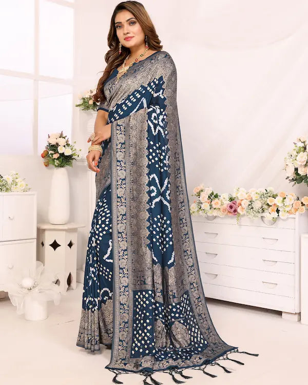 Midnight Mirage Blue Bandhani Saree with Floral Zari Border | Gaji Silk Fabric