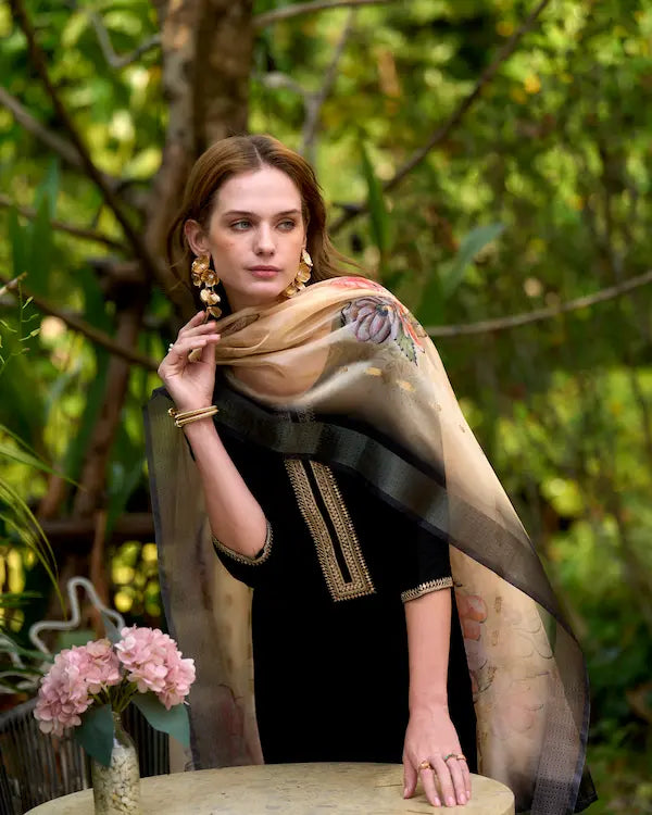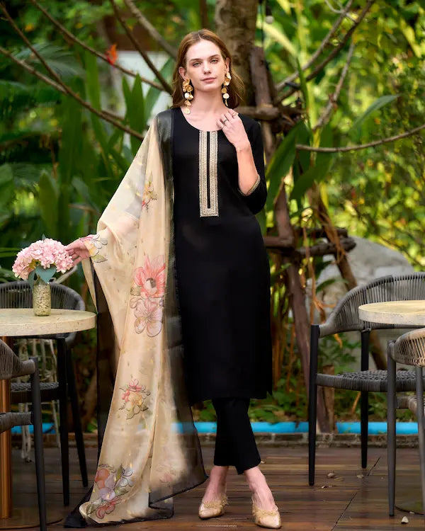 Midnight Muse Black Embroidered Kurti Set with Dupatta | Tissue Fabric
