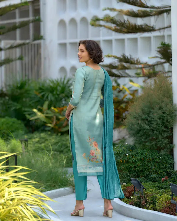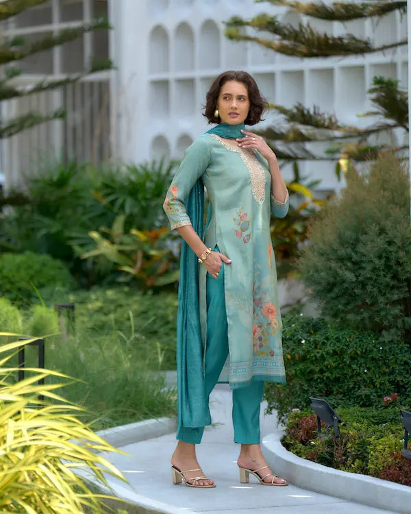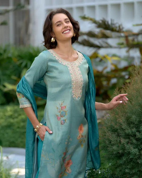 Mint Blossom – Floral Embroidered Tissue Kurti Set with Dupatta
