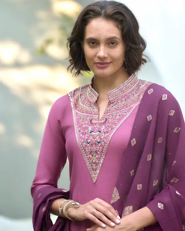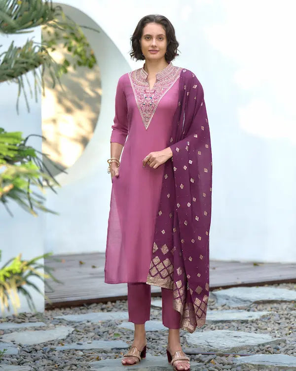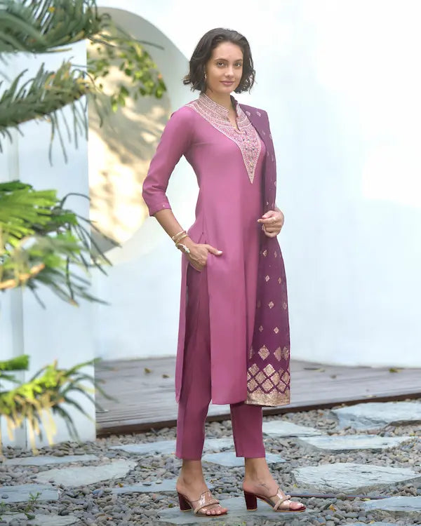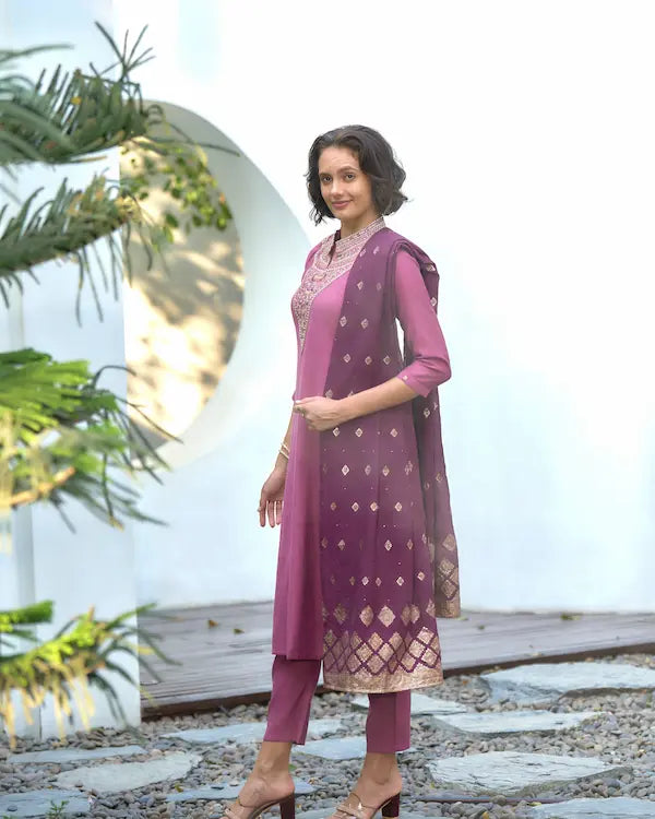 Mulberry Mist Embroidered Kurti Set with Dupatta | Vatican-Chanderi Jacquard