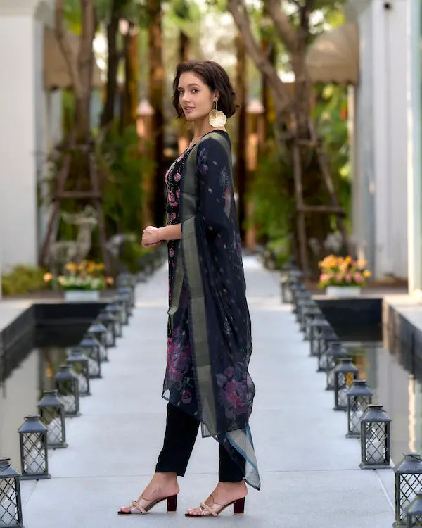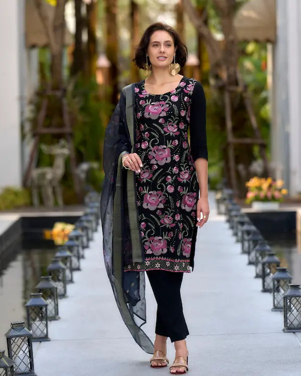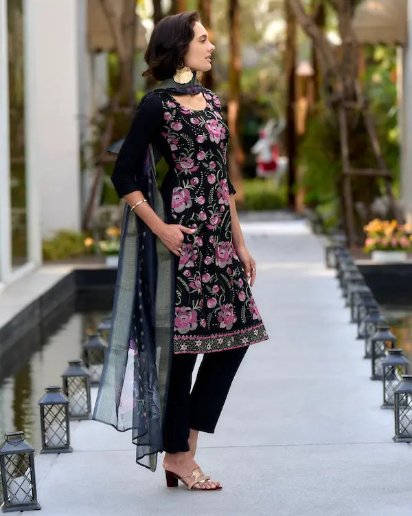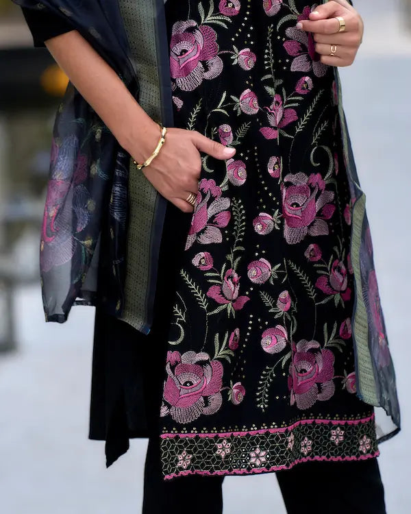 Meet Noir Bloom — where rich black rayon meets vibrant floral embroidery. Bold yet graceful, this set comes alive with an organza butti dupatta that moves like poetry and turns everyday walks into stylish struts.