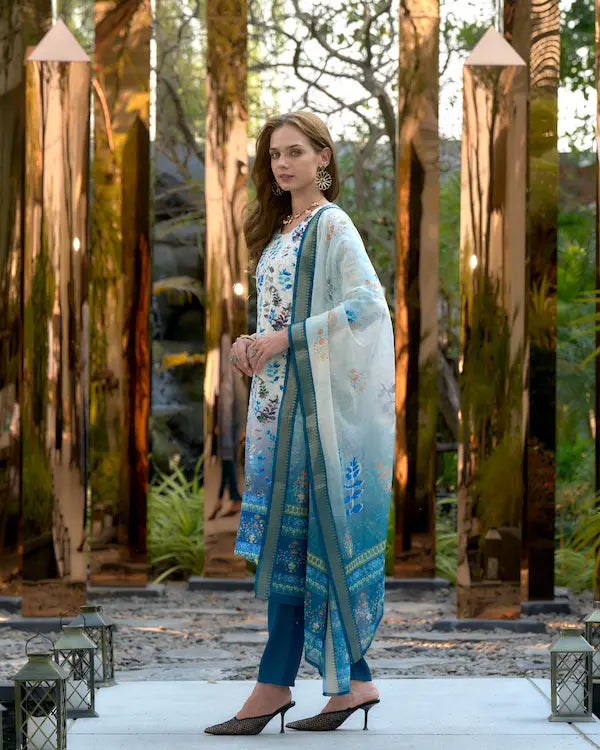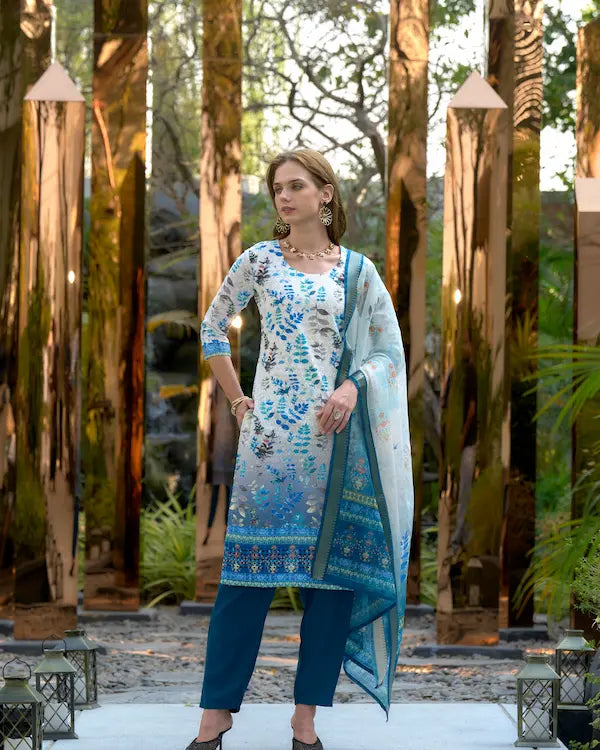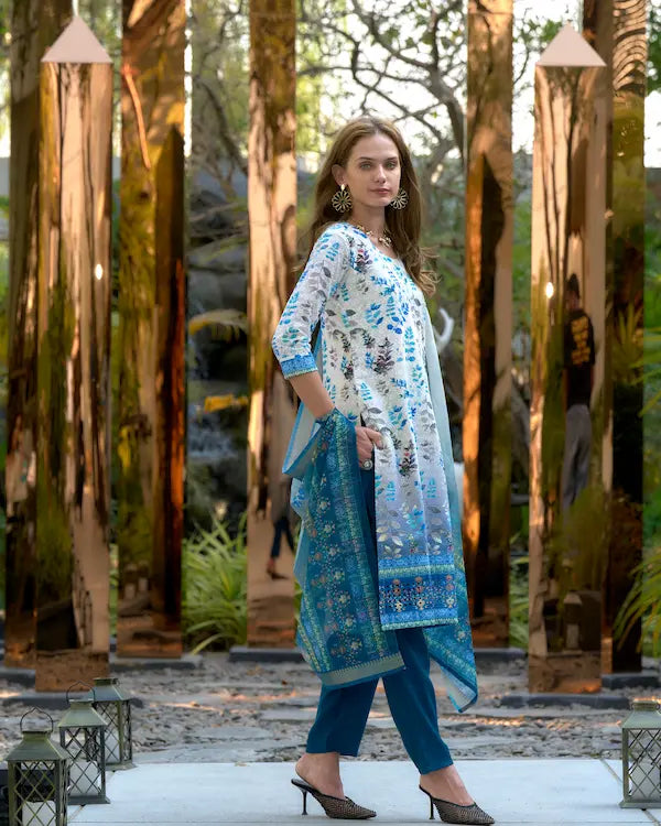 Introducing Ocean Bloom — a tranquil 3-piece kurti set in breathable white cotton, blooming with aqua florals and shaded leaf motifs in cool blues and soft greys. It pairs effortlessly with a sea-washed linen dupatta and rich teal Roman pants, bringing calm sophistication to your everyday style. This set is your flowy retreat in fabric form.