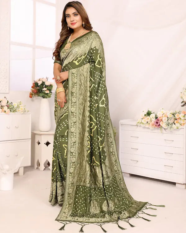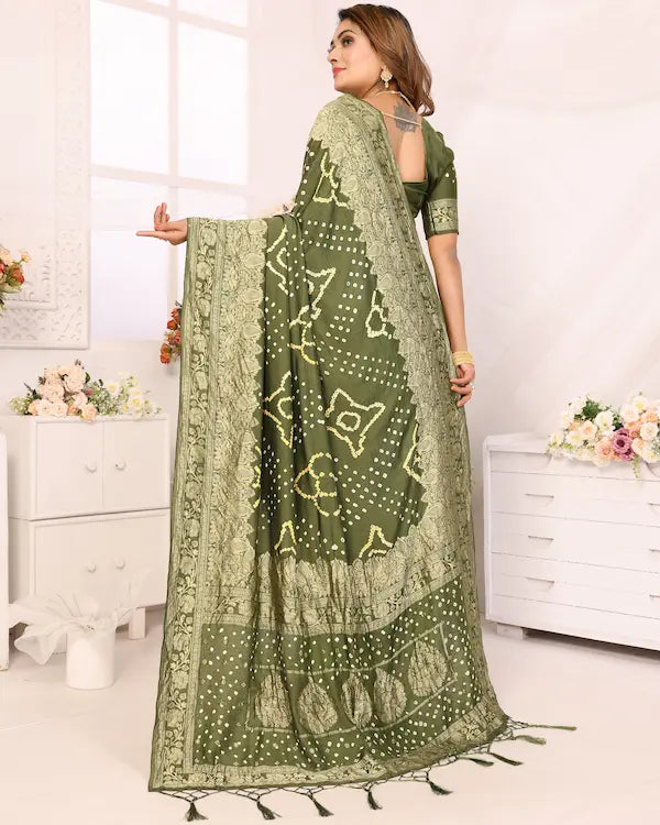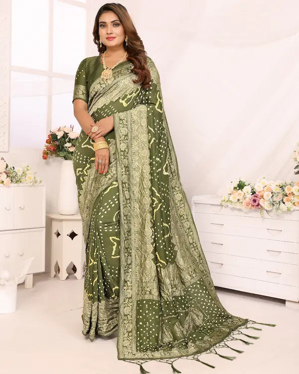 Olive Aura Green Bandhani Saree with Antique Zari Border | Gaji Silk Fabric