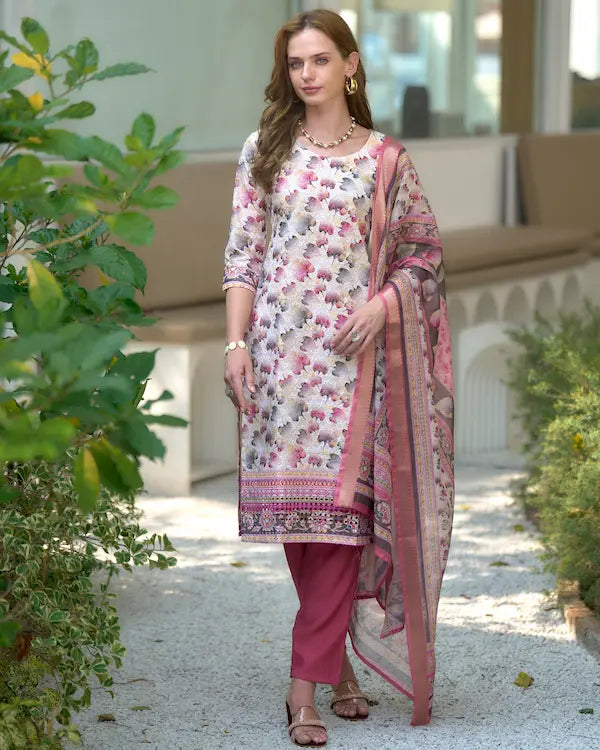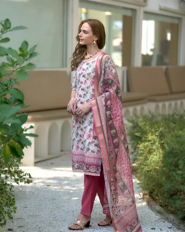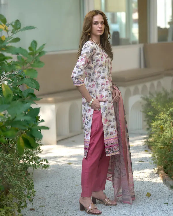 Slip into soft sophistication with Petal Blush — a refreshing 3-piece kurti set crafted in breathable white cotton, kissed with delicate floral prints in rose and mauve. Paired with a breezy printed linen dupatta and rich Roman pink pants, it’s your all-day go-to for brunches, catch-ups, and quiet luxury. This look delivers feminine calm with effortless charm.