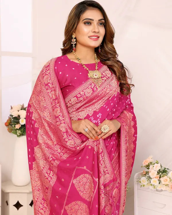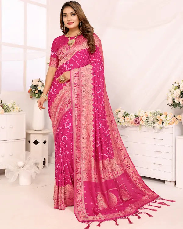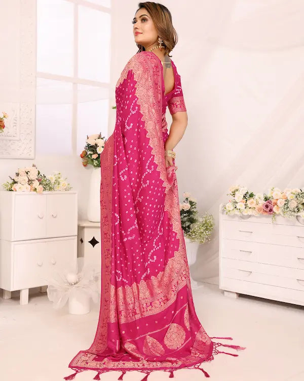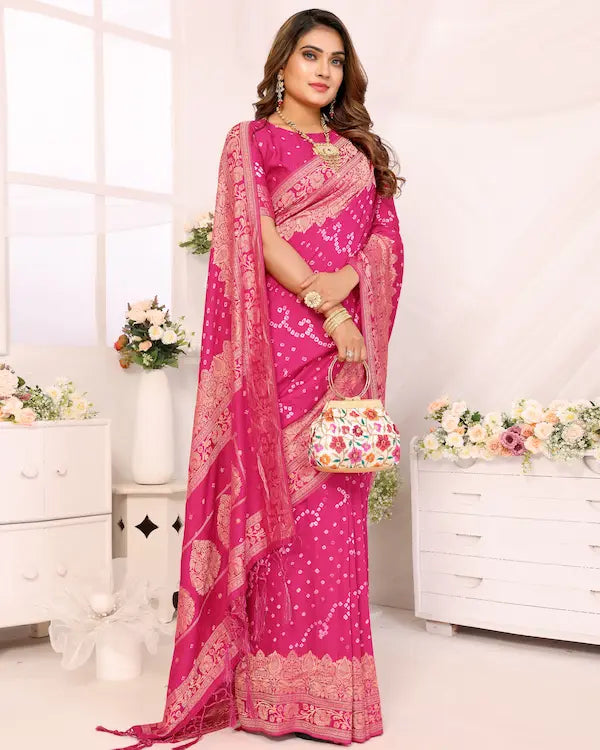 Rosé Radiance Pink Bandhani Saree with Floral Zari Border | Gaji Silk Fabric
