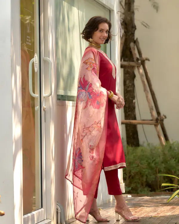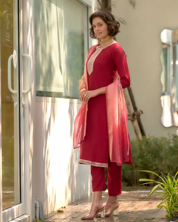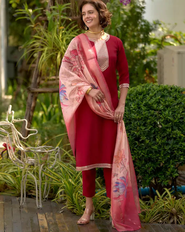 Ruby Bloom Red Embroidered Kurti Set with Dupatta | Tissue Fabric