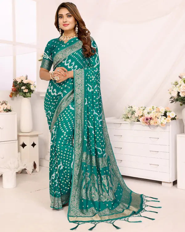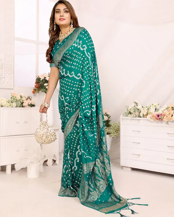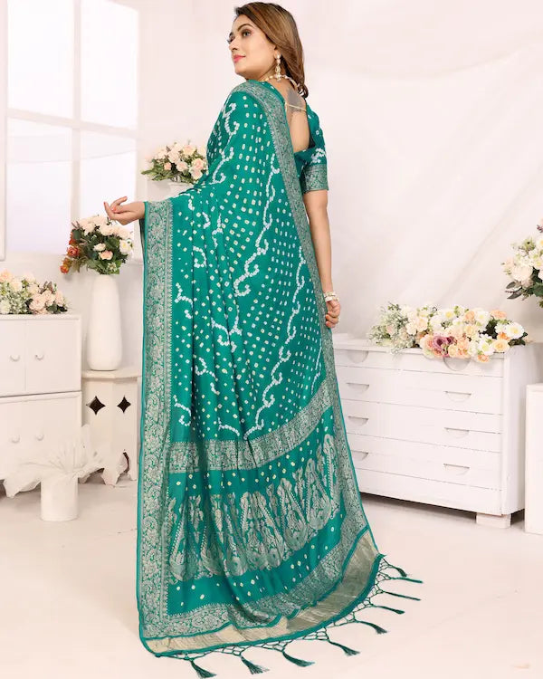 Sea Raaga Green Bandhani Saree with Golden Dandiya Pallu | Gaji Silk Fabric