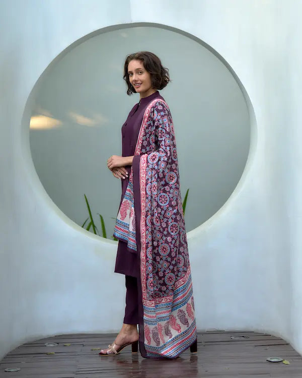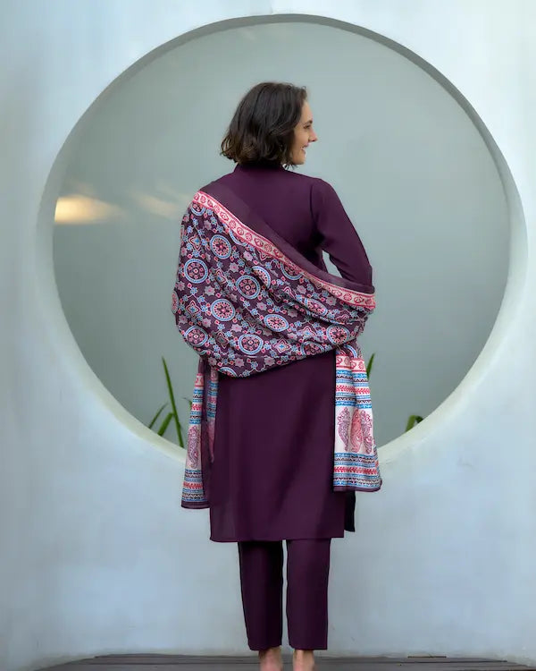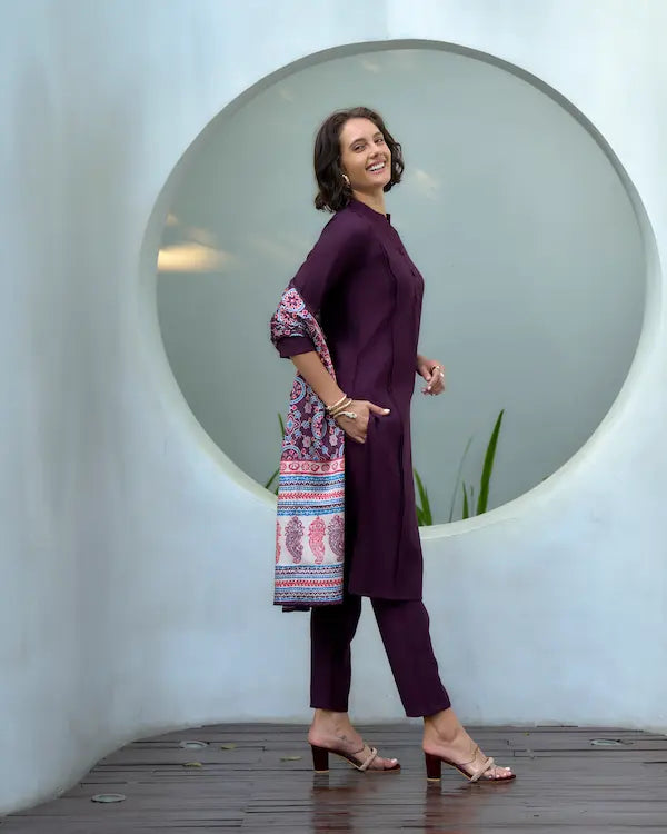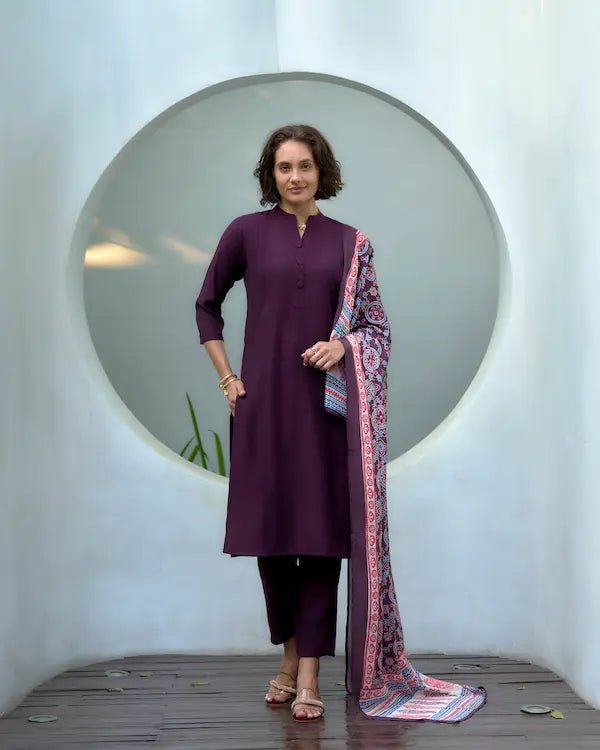 Velvet Plum Purple Kurti Set with Dupatta | Vatican-Chinnon Blend