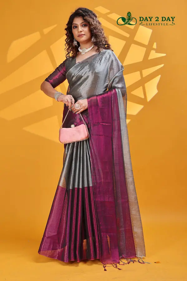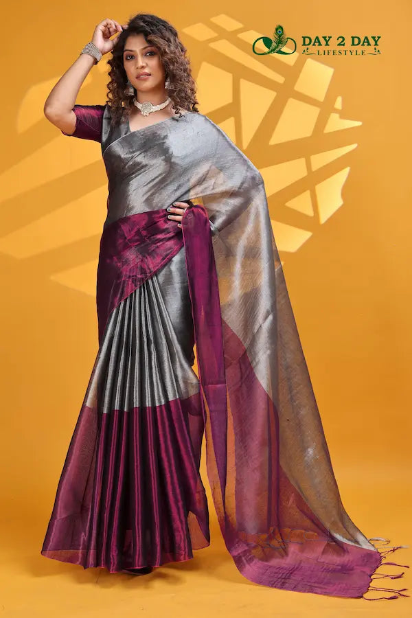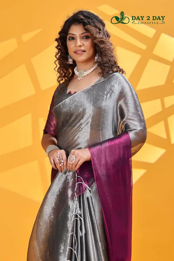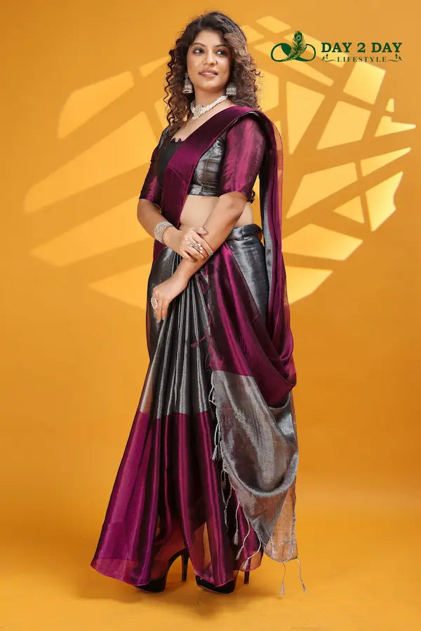 Introducing the Wine Smoke Grey Tissue Cotton Saree, where classic elegance meets bold color play. With its shimmering metallic grey base and rich wine-toned borders, this saree is a statement in grace and grandeur.